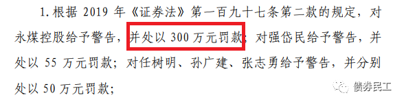 根據wind披露的公開信息,中國證監會于2021年4月20日分別向華晨汽車集團控股有限公司和永城煤電控股集團有限公司下發了《行政處罰事先告知書》(處罰字[2021]24 號)、處罰字[2021]25 號)),分別給予兩家公司罰款5630萬元和300萬元!