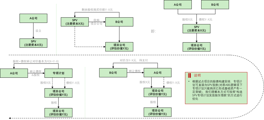 4. 在沒有合適存量負債的情況項下,專項計劃受讓SPV100%股權,然后向SPV發(fā)放股東貸款,SPV以其獲得的股權投資與債權投資,共同出資受讓項目公司100%股權,然后進行反向吸收合并。