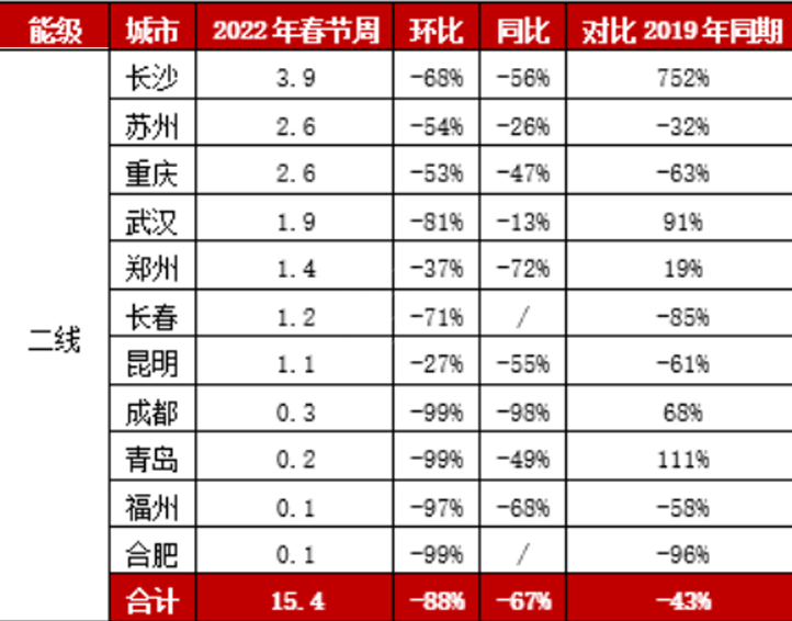 40個重點城市在春節(jié)兩周的新增供應(yīng)量僅為434.4萬㎡,較2021年同期下降23%,撇除2020年新冠疫情影響與2019年對比,降幅也達(dá)到20%。