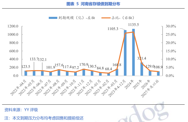 從全省債券到期壓力來看,河南省存續債中有近1,486.6億元將于一年內到期,占比34.7%,各月到期金額相對比較平均,其中2022年8月、2022年11月和2023年3月的到期規模超150億元。