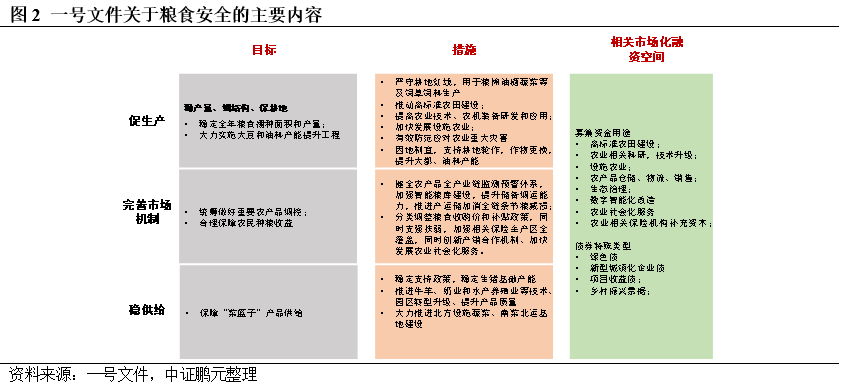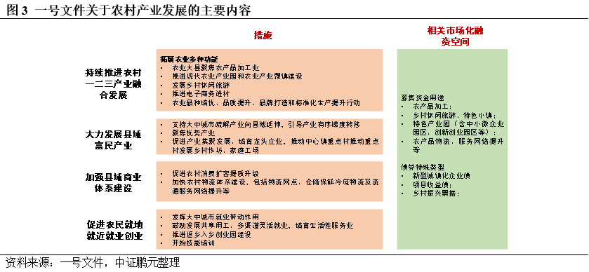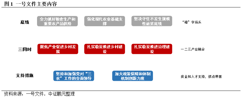 一號文件:一號文件指出,鄉(xiāng)村振興要守住保障國家糧食安全和不發(fā)生規(guī)模性返貧兩條底線,文件共分8個部分,其中,(1)第1-3章,主要說明政策基調(diào)“穩(wěn)”字當頭,包括全力抓好糧食生產(chǎn)和重要農(nóng)產(chǎn)品供給,強化現(xiàn)代農(nóng)業(yè)基礎(chǔ)支撐,堅決守住不發(fā)生規(guī)模性返貧底。其中,“不發(fā)生規(guī)模性返貧”是扶貧攻堅轉(zhuǎn)向鄉(xiāng)村振興的重要環(huán)節(jié),為鄉(xiāng)村振興工作構(gòu)建扎實基礎(chǔ)。(2)第4-6章,具體介紹了鄉(xiāng)村振興的三個領(lǐng)域,包括鄉(xiāng)村發(fā)展、鄉(xiāng)村建設(shè)和鄉(xiāng)村治理,其核心為“促進一二三產(chǎn)業(yè)融合”,以二三產(chǎn)業(yè)促進農(nóng)業(yè)實現(xiàn)轉(zhuǎn)型升級,同時形成產(chǎn)業(yè)效應(yīng),發(fā)展經(jīng)濟、帶動就業(yè),同時推進鄉(xiāng)村基礎(chǔ)設(shè)施改造升級,推進數(shù)字鄉(xiāng)村、綠色鄉(xiāng)村、和諧鄉(xiāng)村的建設(shè)。(3)第7-8章,明確政策支持措施,包括擴大鄉(xiāng)村振興財政資金投入、強化鄉(xiāng)村振興金融服務(wù)和人才隊伍建設(shè),以及積極推動農(nóng)村經(jīng)濟發(fā)展新模式的探索。