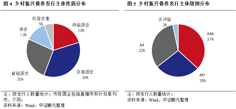 從發(fā)行主體性質(zhì)看,鄉(xiāng)村振興債券參與者主要是國有企業(yè),其中,區(qū)縣國企占比36%,為主要發(fā)行人類型,其次是省級國企,占比26%,市級國企占比20%。從發(fā)行主體級別看,AAA級占比37%,以省級國企和央企為主;AA級占比32%,以區(qū)縣國企為主;AA+級占比28%,以市級和區(qū)縣國企為主。