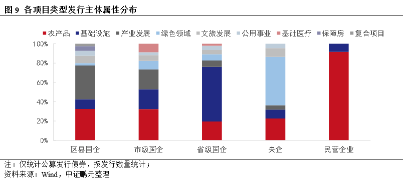 結(jié)合企業(yè)屬性來看:第一,區(qū)縣國企。主要承擔(dān)產(chǎn)業(yè)園區(qū)建設(shè)、農(nóng)貿(mào)市場以及公用事業(yè)項目。此類項目,建設(shè)難度相對較低,但對運營的要求較高,需要關(guān)注運營期的預(yù)期收入情況。第二,市級國企。主要承接農(nóng)產(chǎn)品收儲,其次,是公路建設(shè)和產(chǎn)業(yè)園區(qū),其中公路建設(shè)以償還相關(guān)債務(wù)為主。第三,省級國企。主要負責(zé)高速公路建設(shè),其次是農(nóng)產(chǎn)品收儲。第四,央企。主要承接綠色領(lǐng)域項目,主要包括太陽能、風(fēng)力發(fā)電等新能源項目,其次是農(nóng)產(chǎn)品收儲、流通,主要是農(nóng)業(yè)產(chǎn)業(yè)化龍頭企業(yè),例如,中糧集團、蒙牛等。第五,民營企業(yè),主要是農(nóng)業(yè)產(chǎn)業(yè)化龍頭企業(yè),例如,新希望、金龍魚、伊利,以及德邦,募集資金用于農(nóng)產(chǎn)品收購和物流建設(shè)。