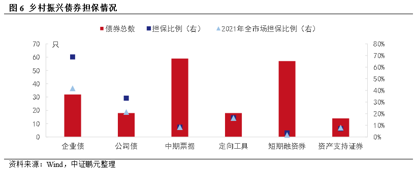 鄉(xiāng)村振興債券發(fā)行情況:截至2022年2月,鄉(xiāng)村振興債券共發(fā)行198只,融資規(guī)模約1,427億元,涉及149家發(fā)行主體。其中,鄉(xiāng)村振興債務(wù)融資工具和專項公司債規(guī)模合計占比85%,是主要品種。第一,鄉(xiāng)村振興債券參與者主要是國有企業(yè),其中,區(qū)縣國企占比36%,為主要發(fā)行人類型。第二,AAA級占比37%,以省級國企和央企為主;AA級占比32%,以區(qū)縣國企為主;AA+級占比28%,以市級和區(qū)縣國企為主。第三,擔(dān)保比例19.7%,企業(yè)債和公司債的擔(dān)保比例明顯高于市場平均水平。第四,募集資金主要用于農(nóng)產(chǎn)品生產(chǎn)、收儲、流通等方面,其次是道路建設(shè)。從使用方式看,有40%的項目是用于償還相關(guān)項目借款,39%用于項目建設(shè),15%用于農(nóng)產(chǎn)品收儲。第五,不同類型企業(yè)承擔(dān)不同項目。區(qū)縣國企主要承擔(dān)產(chǎn)業(yè)園區(qū)建設(shè)、農(nóng)貿(mào)市場以及公用事業(yè)項目;市級國企主要承接農(nóng)產(chǎn)品收儲;省級國企主要負責(zé)高速公路建設(shè),央企主要承接綠色領(lǐng)域項目,主要包括太陽能、風(fēng)力發(fā)電等新能源項目;民營企業(yè),募集資金主要用于農(nóng)產(chǎn)品收購和物流建設(shè)。