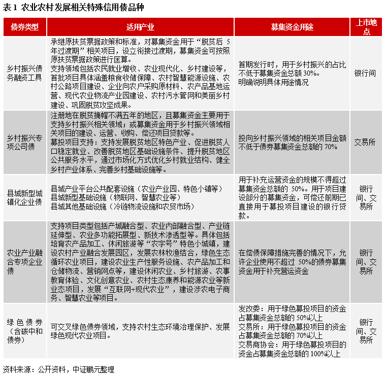 一號文件明確,擴大鄉(xiāng)村振興投入,繼續(xù)把農(nóng)業(yè)農(nóng)村作為一般公共預(yù)算優(yōu)先保障領(lǐng)域。除財政和信貸資金支持外,結(jié)合現(xiàn)有鄉(xiāng)村振興政策,債券融資可以從以下領(lǐng)域入手:第一,募集資金用途可以用于高標準農(nóng)田建設(shè)、農(nóng)業(yè)相關(guān)科研,技術(shù)升級,設(shè)施農(nóng)業(yè),農(nóng)產(chǎn)品倉儲、物流、銷售,生態(tài)治理以及農(nóng)業(yè)相關(guān)保險機構(gòu)補充資本。第二,從債券類型看,可以采用綠色債、新型城鎮(zhèn)化企業(yè)債、項目收益?zhèn)⑧l(xiāng)村振興票據(jù)等。