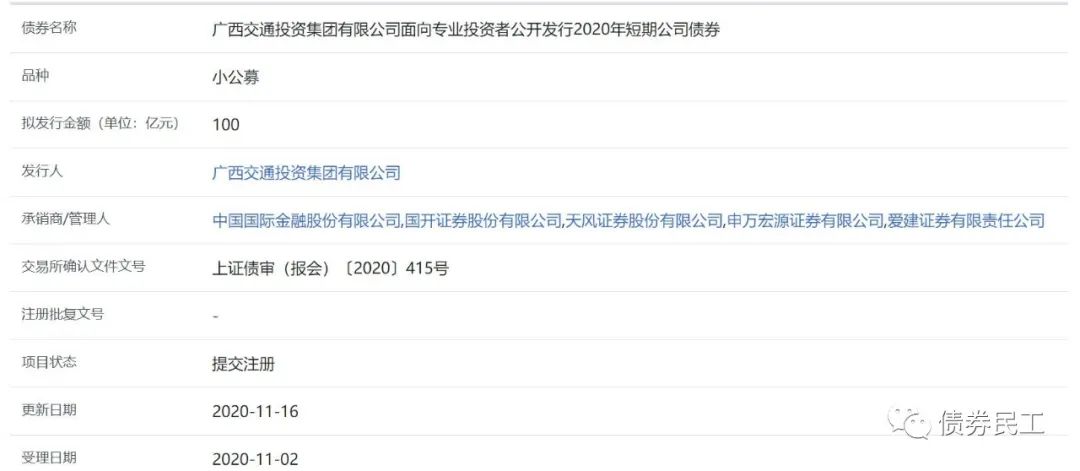 1、廣西交通投資集團有限公司于2020年11月17日提交的面向專業投資者公開發行2020年短期公司債券被終止,擬發行金額為100億元。廣西交通投資集團有限公司的實際控制人為廣西壯族自治區國資委,主體信用評級為AAA(中誠信國際、大公國際和聯合資信),目前存續債券金額為244.70億元,存續債券只數20只,存續債券產品包括公司債券、企業債券、債務融資工具和境外債。