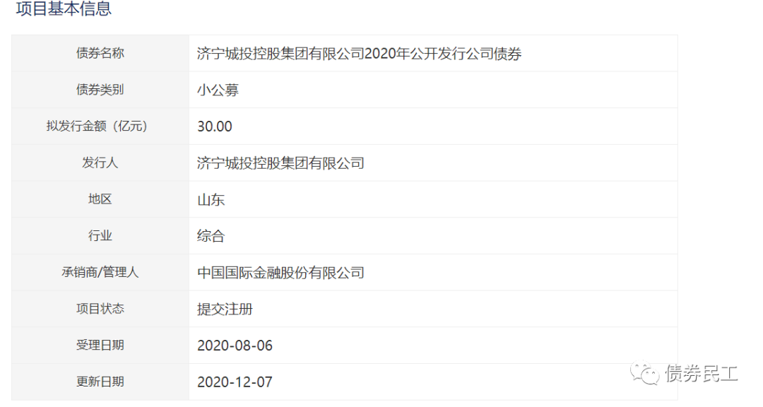 2、濟寧城投控股集團有限公司于2020年12月10日提交的面向專業投資者公開發行公司債券被終止,債券擬發行金額為30億元。濟寧城投控股集團有限公司的實際控制人為濟寧市國資委,主體信用評級為AA+(中誠信國際、大公國際和中證鵬元),目前存續債券金額為154.50億元,存續債券只數17只,存續債券產品包括公司債券、企業債券和債務融資工具。