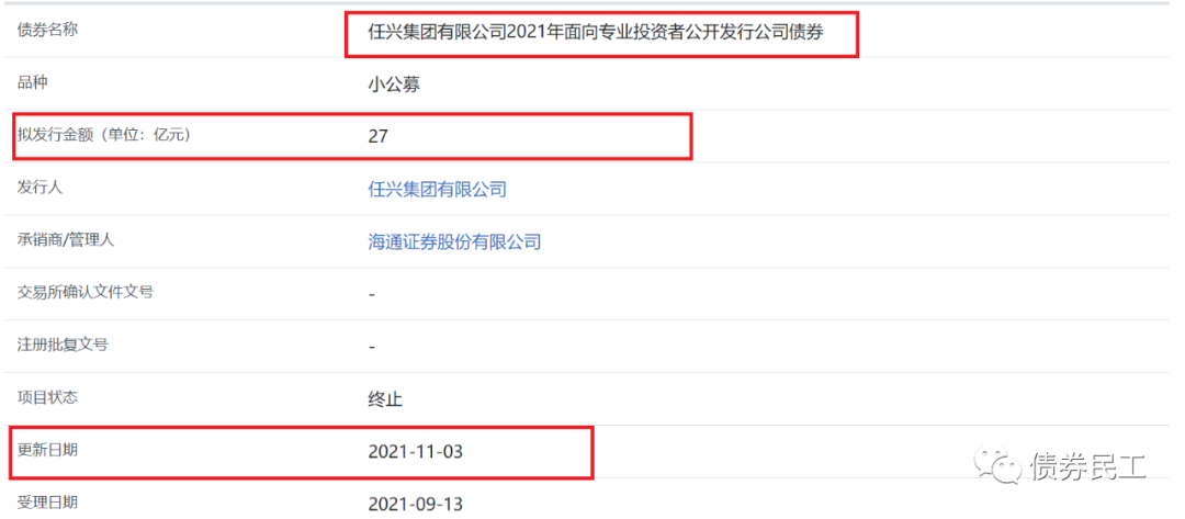 就在2021年11月3日,濟寧市另一城投公司——任興集團有限公司申報的總額為27億元的小公募公司債券被上交所終止。任興集團有限公司的實際控制人為濟寧市任城區國有資產運營服務中心,目前存續債券金額64億元,存續債券9只,存續債券產品為私募債和PPN。