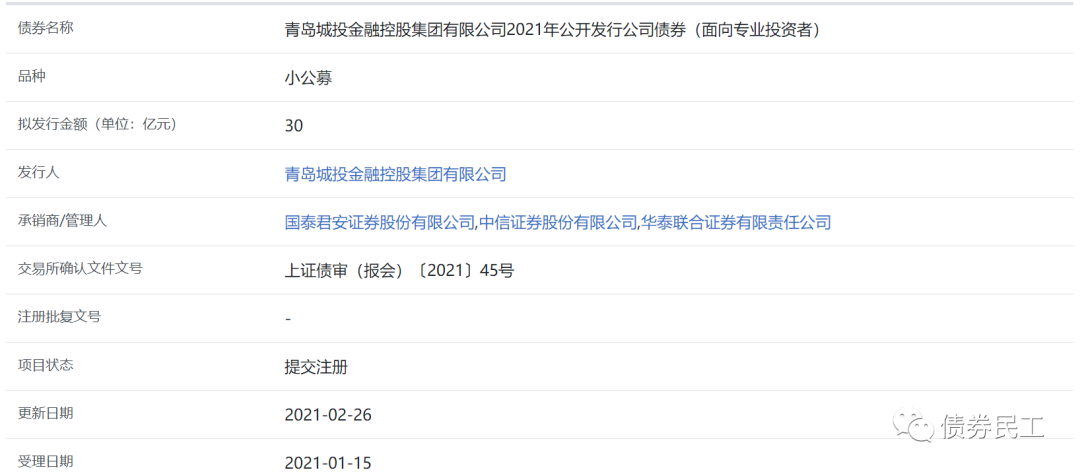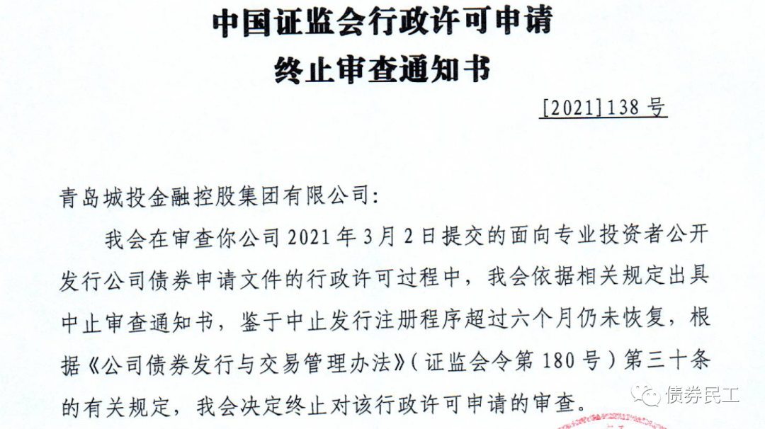 上述終止的公司債券項目中,值得關注的是青島城投金融控股集團有限公司,2021年3月2日申報的2021年公開發行公司債券(面向專業投資者)被終止,債券擬發行金額為30億元。