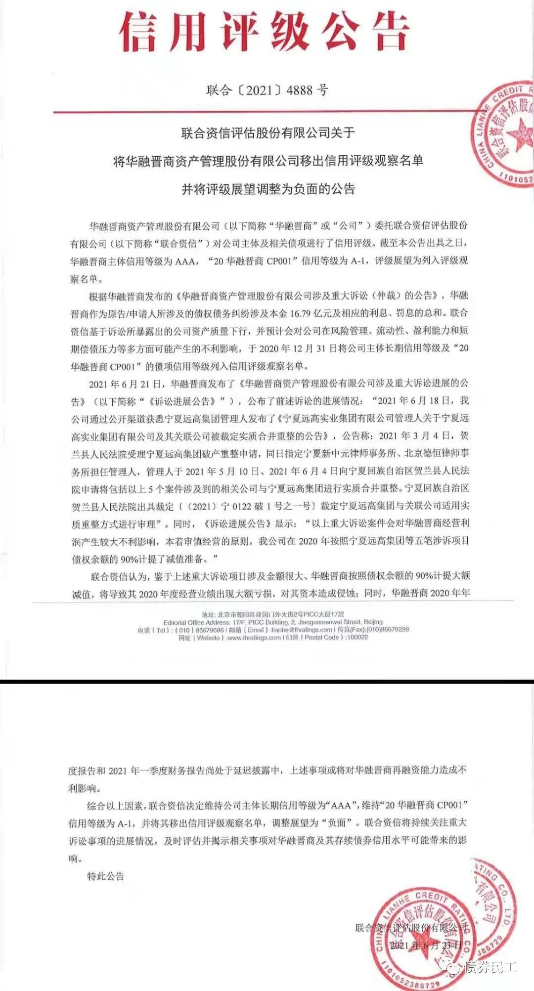 根據聯合資信2021年6月23日出具的評級報告,華融晉商資產管理股份有限公司(以下簡稱“華融晉商”)的評級展望調整為負面!此次調整的主要原因是公司涉及16.79億元的重大訴訟。根據華融晉商2021年6月21日的公告,寧夏遠高集團已經開被裁定實質合并重整,公司在2020年對寧夏遠高集團等5筆訴訟債權按照債權余額的90%計提了減值準備。