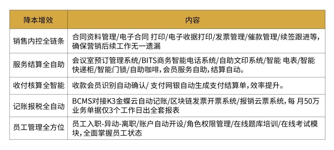 公司披露,已自主研發應用多層次的信息技術平臺和智能化系統,包括BCMS商務中心綜合管理系統、BITS智能秘書接電服務系統、方圓間APP和社群交流平臺、銀企直連自動付款系統、BCMS-CLOUD自動記賬系統等。