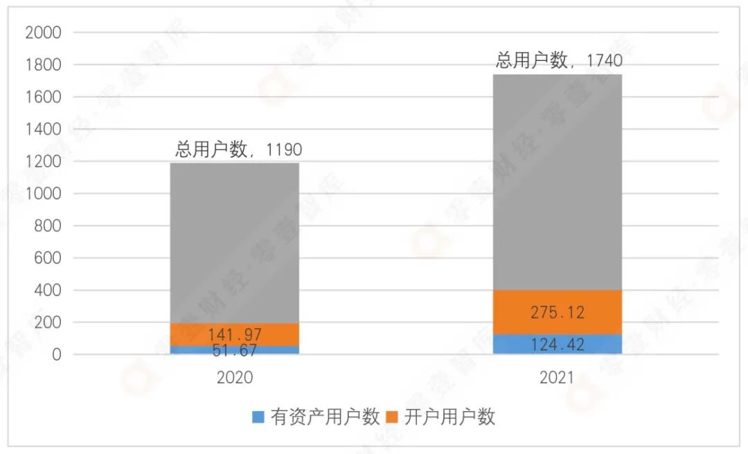 業績的高增長離不開用戶數量的加速擴張以及客戶資產質量的進一步提升,截至2021年末,富途用戶已覆蓋超過200個國家和地區,旗下平臺富途牛牛和moomoo注冊用戶總數達1740萬,同比增長45.8%,其中開戶客戶數為275.12萬名,有資產客戶數為124.42萬名,相比2020年同期分別增長93.8%和140.8%。客戶總資產額達到4078億港元,同比增長43%。