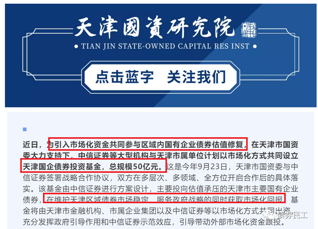 根據(jù)天津市國資委的微信公眾號,天津市設立了50億元的國企債券投資基金,用于維護天津區(qū)域債券市場穩(wěn)定,修復國有企業(yè)債券估值。