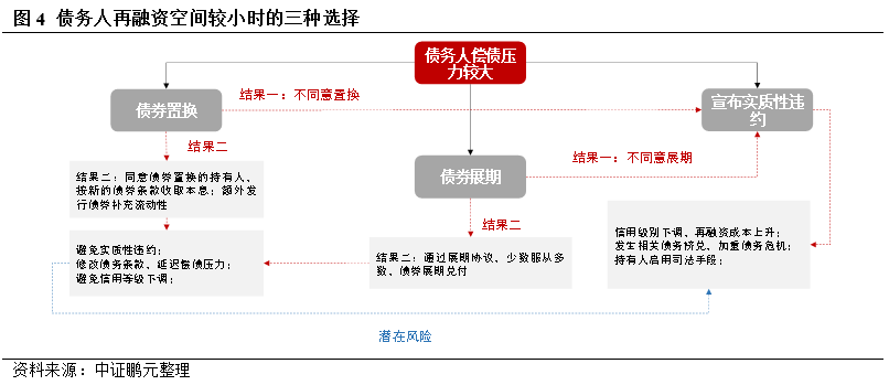 債券置換和展期,均面向原債券持有人,償付壓力延后,借新還舊則面向全市場(chǎng)投資者。債券展期、債券置換與借新還舊有不同的適用背景、操作流程和結(jié)果。整體看,僅僅是短期流動(dòng)性出現(xiàn)問題,造成短期償債壓力增加的企業(yè),適合借新還舊,尤其是市場(chǎng)利率走低的時(shí)期。而債券展期或債券置換適合外部融資空間有限、需進(jìn)行負(fù)債結(jié)構(gòu)調(diào)整的企業(yè),其中無內(nèi)、外部融資空間,經(jīng)營(yíng)情況欠佳,債務(wù)規(guī)模較大,短償債能力無法明顯改善的困境企業(yè)[1]可能會(huì)出現(xiàn)困境置換或展期,即展期或置換條款對(duì)持有人利益帶來實(shí)質(zhì)性削弱。
