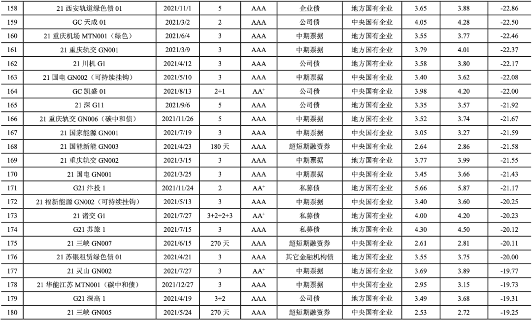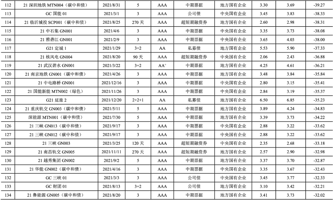 2021年,我國共有247期綠色債券的發行利率低于可比債券[14]的平均發行利率(詳見附表2),占比達到72.01%。2021年具有成本優勢的綠色債券的加權平均息差[15]為-24.64BP。具有成本優勢的綠色債券以國有企業(241期)為主,民營企業4期,公眾企業2期。