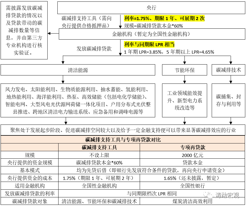 (1)央行提供資金的成本不同,碳減排支持工具與專項(xiàng)再貸款的利率分別為1.75%和1.65%(還未披露、暫定)。