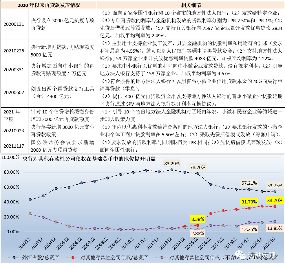 3、不過(guò)后來(lái)隨著出口貿(mào)易規(guī)模的擴(kuò)大以及央行公開市場(chǎng)操作工具的豐富,外匯占款和公開市場(chǎng)操作逐步成為央行投放基礎(chǔ)貨幣的主要方式,再貸款(再貼現(xiàn))工具的重要性有所下降。外匯占款在央行總資產(chǎn)中的比例已由2013年的83.29%降至2021年10月底的53.75%,而對(duì)其他存款性公司債權(quán)占總資產(chǎn)的比例亦由2009年的3.15%升至2021年10月底的33.70%