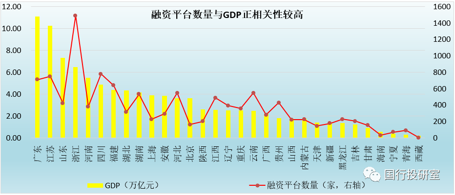 2、數(shù)據(jù)上顯示,融資平臺數(shù)量分布與地區(qū)GDP之間有較高的相關(guān)性,如融資平臺主要分布在浙江、四川、江蘇、廣東、福建、河北、云南、湖南、江西、貴州、山東、遼寧等12個地區(qū)的融資平臺數(shù)量占比達到70%左右。這主要是因為穩(wěn)增長的背景下,承擔著各地基建主要任務(wù)的融資平臺具有存在的必要性,特別是地方政府債券額度較為有限的低經(jīng)濟總量地區(qū)。