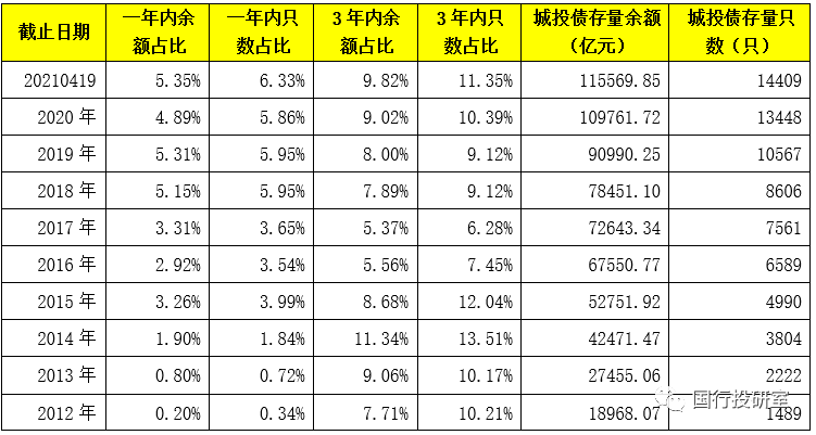 2、截至2021年4月19日,1年內(nèi)和3年內(nèi)城投債存量余額占比分別為5.35%和9.82%,且從整體趨勢上看,城投債的期限有縮短傾向。