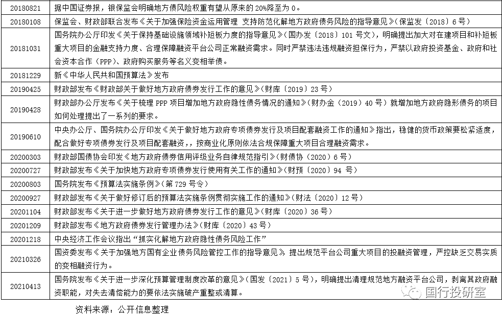 4、2018年8月,國務(wù)院發(fā)布《關(guān)于防范化解地方政府隱性債務(wù)風險的意見》(中發(fā)〔2018〕27號),要求地方政府通過“統(tǒng)籌資金、償還一批;債務(wù)置換、展期一批;項目運營、消化一批;引入資本、轉(zhuǎn)換一批”等方式在5-10年內(nèi)化解地方政府隱性債務(wù)。