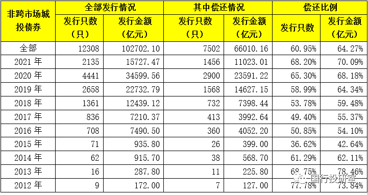 1、截至2021年4月19日,全部12308只未跨市場發(fā)行的城投債中,有7502只的資金用途為償還存量債務(wù)、占比達到60.95% 這10.27萬億的未跨市場發(fā)行的城投債中,有6.60萬億的資金用途為償還存量債務(wù)、占比達到64.27%。