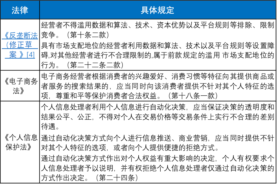 在法律法規層面,除《反壟斷法》相關規定外,《電子商務法》、《個人信息保護法》等多部法規都對算法規制作出規定,具體如下表所示: