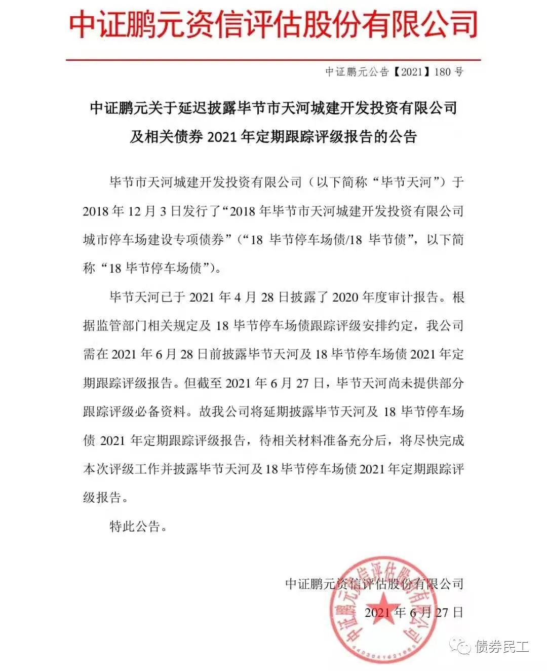3、畢節市天河城建開發投資有限公司(以下簡稱“畢節天河城建”)未提供部分跟蹤評級必備資料,延遲披露跟蹤評級報告。在畢節天河城建2020年年報已經出具且無重大特定事項的情況下,這種跟蹤評級報告延遲披露的情況并不常見。