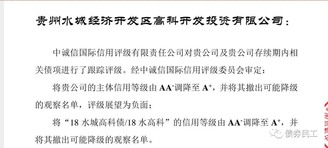 1、貴州水城經濟開發區高科開發投資有限公司(以下簡稱“貴州水城經開”)的主體信用評級由AA-下調至A+。這不是貴州水城經開第一次評級下調了。2020年12月17日,中誠信國際將貴州水城經開主體信用等級由AA調降至AA-,并繼續列入可能降級的觀察名單。貴州水城經投在2020年12月18日發布公告,明確指出“對突然評級下調存在異議”