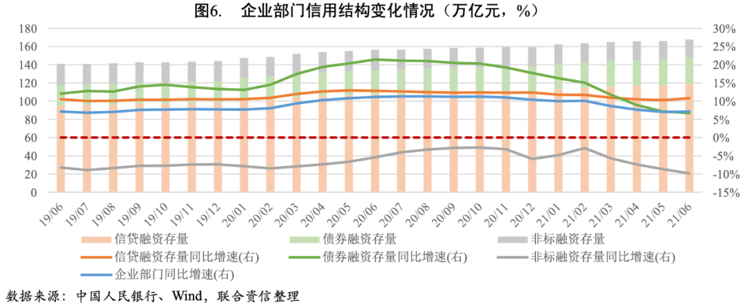 企業部門信用結構進一步分化。在上年同期高基數影響下,截至2021年6月末,企業部門信貸融資、債券融資以及非標融資存量同比增速均有所下降。信貸融資基本保持平穩增長,同比增速小幅下降1.58個百分點至10.78%。2021年上半年非金融企業部門新增人民幣貸款8.37萬億元,為僅次于上年同期的歷史較高值。從結構來看,中長期貸款仍是主導地位,新增6.62萬億元,創歷史新高,反映出企業資本開支需求旺盛;新增短期貸款與票據融資同比少增,反映出企業流動性管理訴求趨于正常。債券融資下降明顯,同比增速大幅下降10.98個百分點至6.72%。上半年新增債券融資規模不及上年同期的一半,除上年高基數影響之外,上半年企業債券發行利率較上年同期顯著升高、4月底出臺政策加強公司債信息披露要求和限制發行規模以及募集用途等因素可能也對企業發債產生一定抑制作用。非標融資持續壓降,同比增速進一步下降3.96個百分點至-9.84%。上半年非標融資規模收縮8437億元,同比多減8698億元。