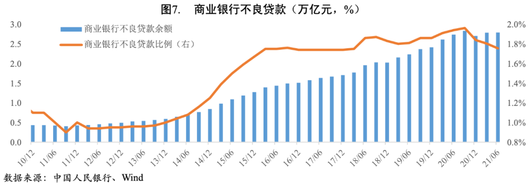 截至2021年6月末,我國商業銀行不良貸款余額2.79萬億元,較上年末增加892.78億元;商業銀行不良貸款率1.76%,較上年末下降0.08個百分點,主要是國內經濟延續良好復蘇態勢,疊加監管部門引導金融機構強化風險防范、加大不良處置力度,使得商業銀行信貸資產質量保持穩定。此外,去年為對沖疫情影響出臺的普惠小微企業貸款延期還本付息政策和信用貸款支持政策,進一步延長至2021年底,有利于穩定企業現金流,緩釋流動性風險,對商業銀行不良貸款率的穩定具有積極效果。