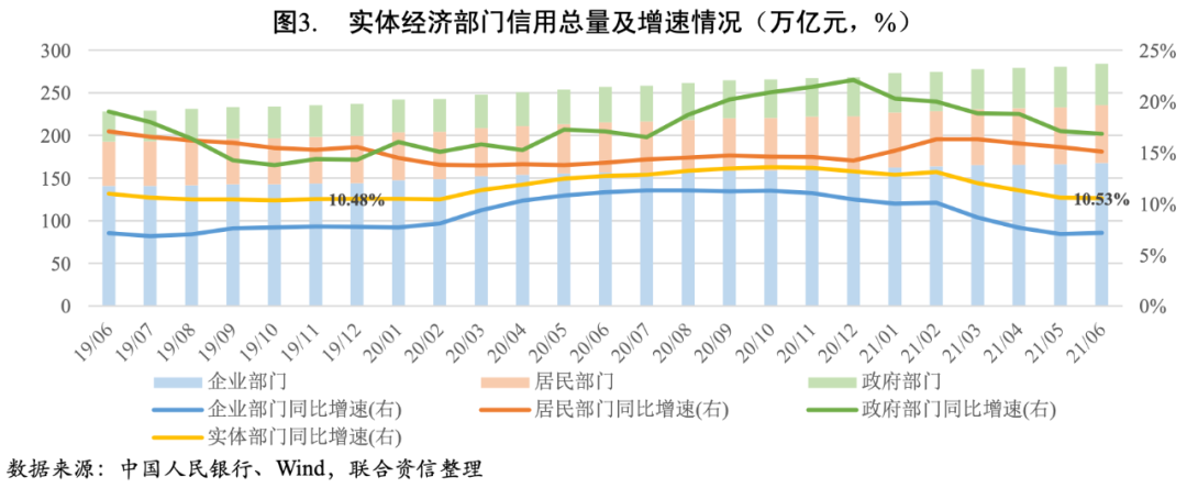 2021年上半年我國實體經濟部門信用擴張整體呈現放緩的趨勢。截至2021年6月末,我國實體經濟部門信用總量達到284.03萬億元[2],較上年末凈增15.72萬億元;同比增長10.53%,增幅較上年末回落2.63個百分點,基本下降至疫情前的水平。