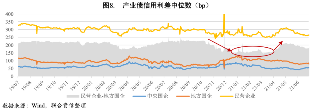 2021年上半年,債券市場新增違約主體18家,到期違約金額合計約778.97億元,較上年同期有所上升,債券市場信用風險繼續釋放。從信用利差來看,在上年四季度連續發生大型國企的違約事件后,地方國企的產業債信用利差迅速走高,與民營企業產業債信用利差之差(圖8中灰色部分)縮窄近80bp,今年一季度仍保持在較低的150bp左右,與一季度國企違約事件頻發[4]相印證,高杠桿、弱資質國企信用風險繼續暴露;二季度國、民企利差出現分化,民營企業信用利差上行,地方國企信用利差呈下行趨勢,反映出二季度民企違約數量有所增加,信用風險上升,市場對地方國企的擔憂情緒有所緩和。