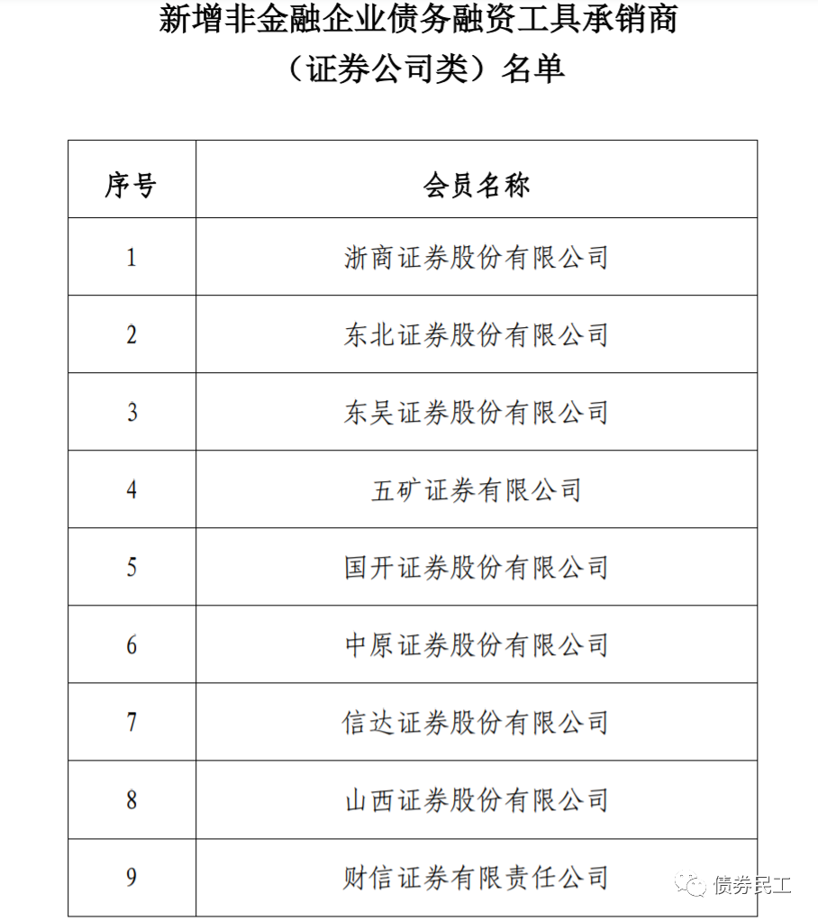根據銀行間交易商協會2021年9月26日印發的《關于意向承銷類會員(證券公司類)參與非金融企業債務融資工具承銷業務市場評價結果的公告》,浙商證券、東北證券、東吳證券、五礦證券、國開證券等9家證券公司可開展非金融企業債務融資工具承銷業務。需要注意的是,這9家證券公司獲得的是承銷商資質,不是主承銷商資質。