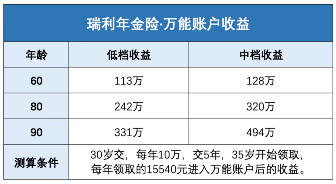 如果老王35歲領(lǐng)取時(shí)不著急用錢,把錢放到萬能賬戶二次增值。