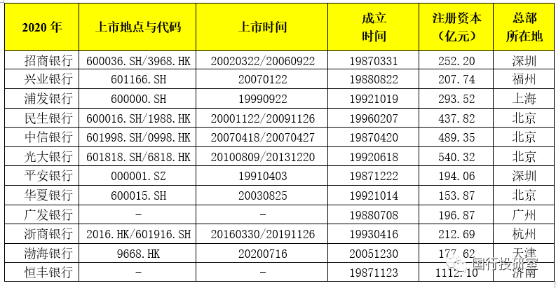 4家總部位于北京(分別為民生銀行、中信銀行、光大銀行與華夏銀行);2家總部位于深圳(招行與平安銀行);1家總部位于福州(興業(yè)銀行);1家總部位于上海(浦發(fā)銀行);1家總部位于廣州(廣發(fā)銀行);1家總部位于天津(渤海銀行);1家總部位于濟南(恒豐銀行);1家總部位于杭州(浙商銀行)。
