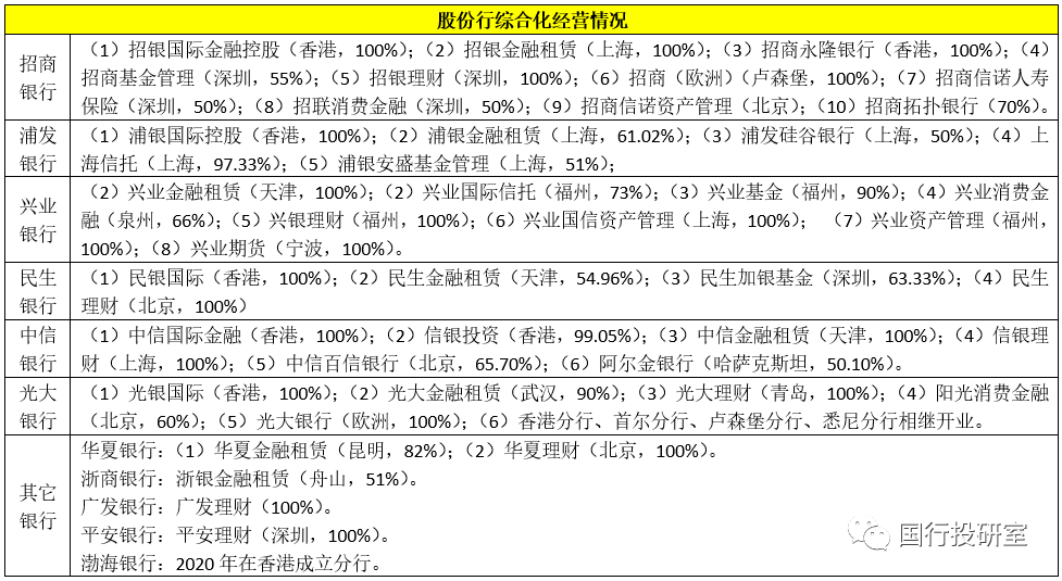 從綜合化經營來看,股份行之間分化最為明顯。