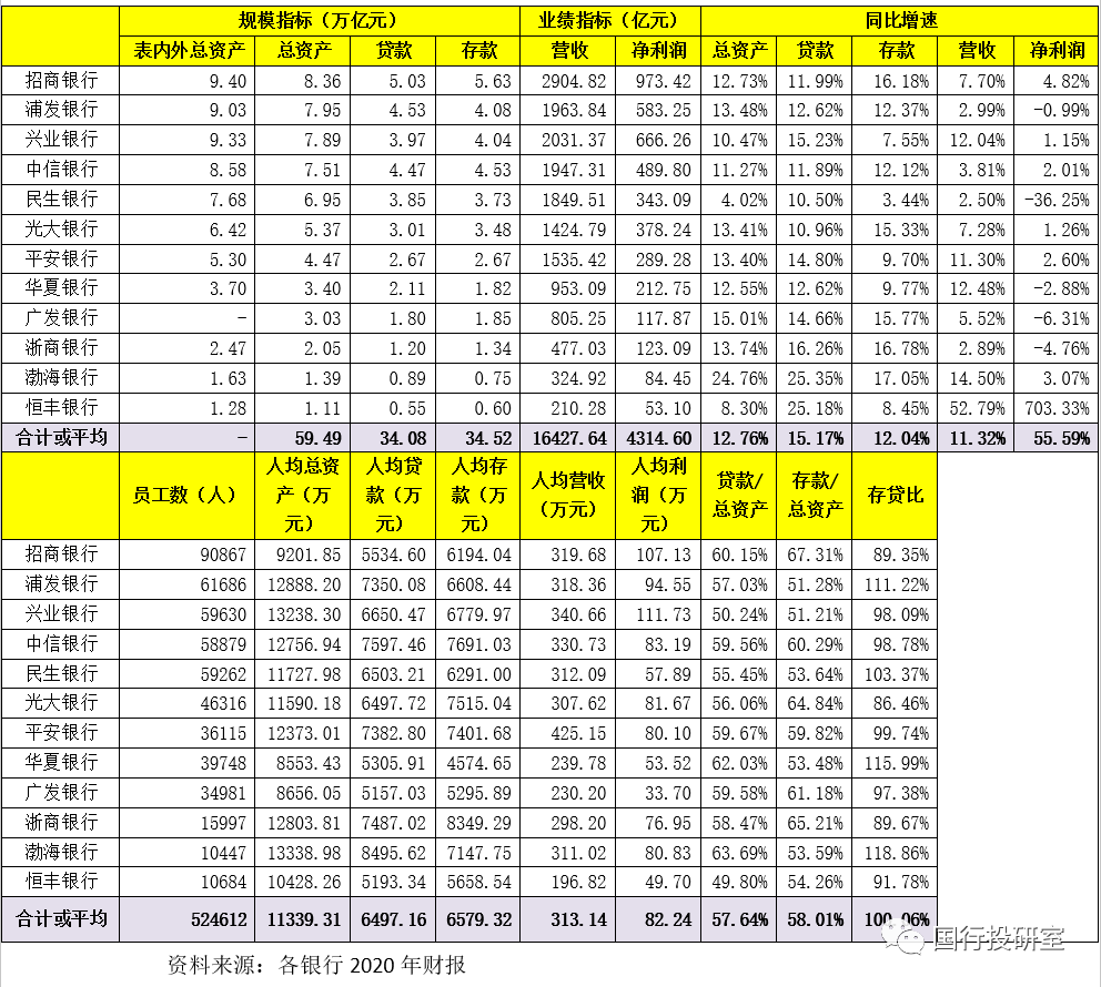 12家股份行共擁有52.46萬名員工,總資產、貸款與存款合計分別為59.49萬億、34.08萬億、34.52萬億,合計實現(xiàn)16248億元營收和4315億元凈利潤。