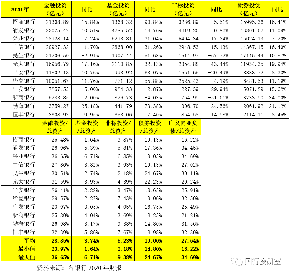 特別是從增速上看,2020年民生銀行、浙商銀行、光大銀行、平安銀行、中信銀行、招商銀行等均在壓降非標投資規(guī)模,尤以民生銀行與光大銀行最為明顯。而對于債券投資和基金投資而言,股份行普遍加大了配置力度,這表明金融投資的內部結構調整是股份行正在做的事情。