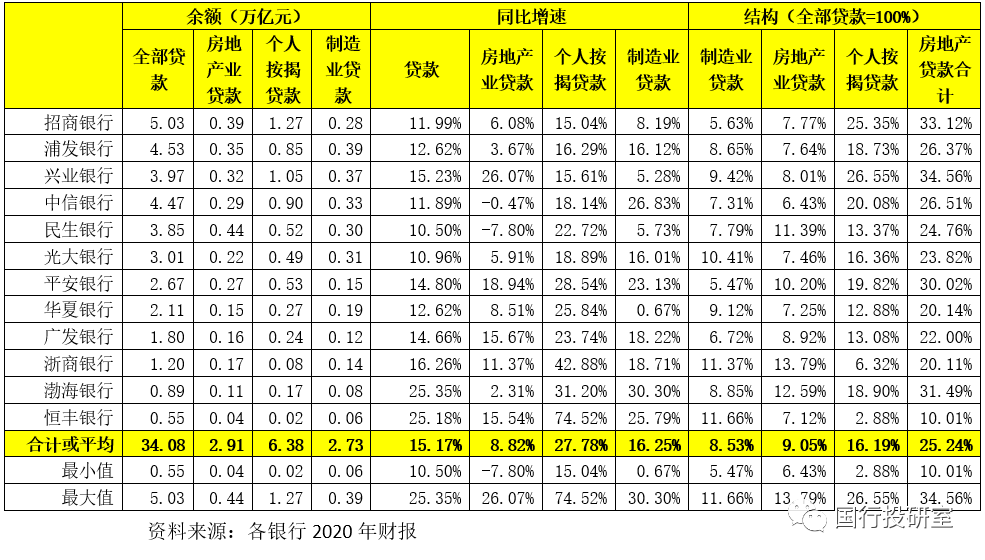 (1)截至2020年底,12家股份行的制造業(yè)貸款余額達到2.73萬億、個人住房貸款余額為6.38萬億(全部房地產貸款余額為9.29萬億)。