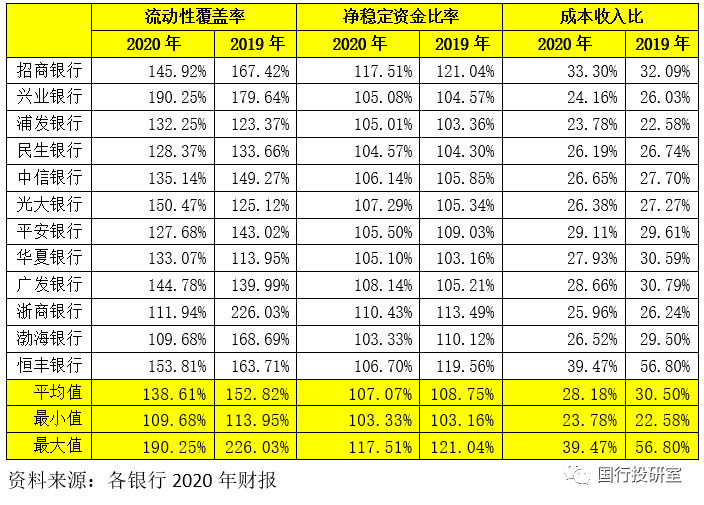 1、2020年,12家股份行的流動性覆蓋率、凈穩(wěn)定資金比例平均分別為138.61%和107.07%,整體上看較2019年有一定下降。