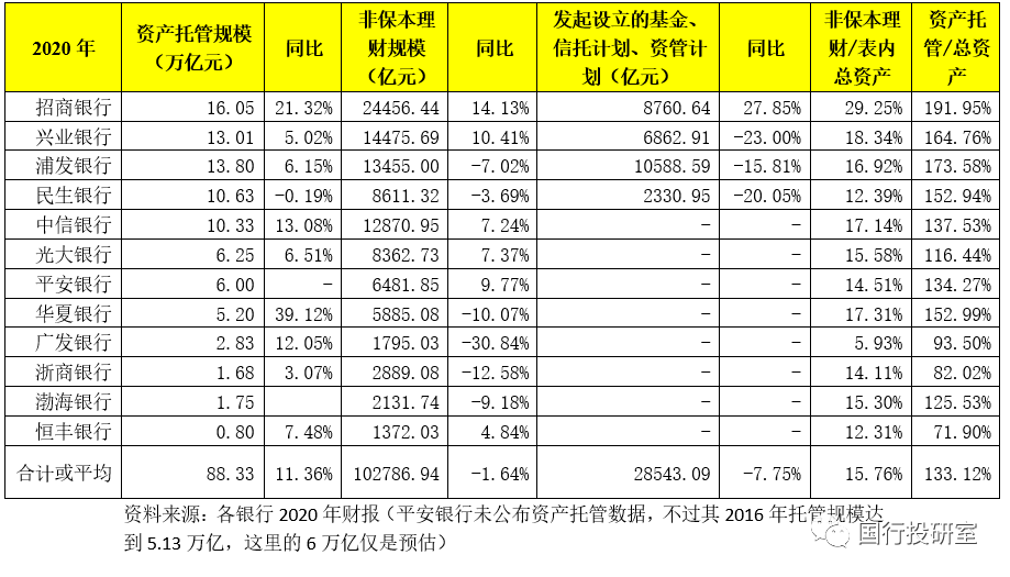 除傳統(tǒng)表內業(yè)務外,以非保本理財和資產托管為代表的表外業(yè)務亦是股份行的亮點(實際上目前頭部城商行亦在這兩類業(yè)務上發(fā)力)。截至2020年底,12家股份行的資產托管和非保本理財余額合計分別達到88.83萬億和10.28萬億,占表內總資產的比例平均值分別達到15.76%和133.12%。