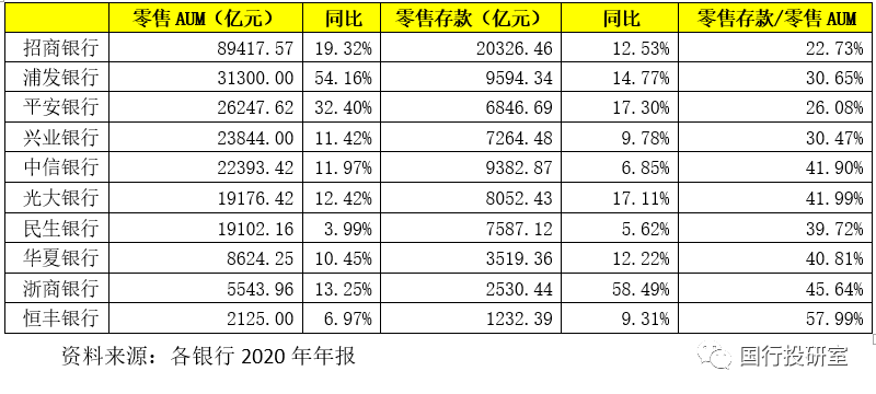 (一)目前有10家股份行公布了零售AUM指標(廣發(fā)銀行與渤海銀行未公布),招行以8.94萬億的零售AUM遠超其它股份行(排在第二位的浦發(fā)銀行零售AUM僅為3.13萬億)。平安銀行的零售存款雖然位居第7、但其零售AUM卻高居第三。