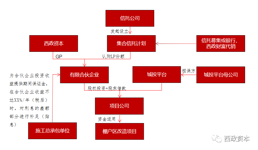 為便于說(shuō)明,我們就當(dāng)前正在操作的城投平臺(tái)非標(biāo)融資架構(gòu)做簡(jiǎn)要說(shuō)明,以供同業(yè)人士參考: