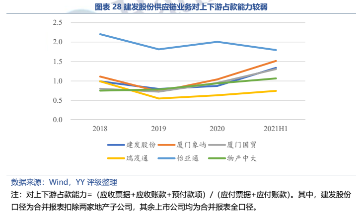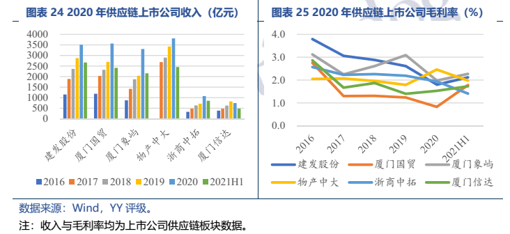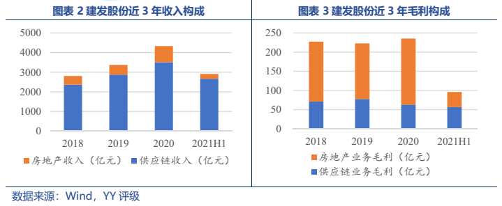 作為一家“供應鏈+地產(chǎn)”雙主業(yè)經(jīng)營的企業(yè),建發(fā)股份左手有供應鏈業(yè)務提供的穩(wěn)定現(xiàn)金流,右手有地產(chǎn)開發(fā)帶來的高額利潤,兩大業(yè)務在盈利與現(xiàn)金流方面實現(xiàn)了一定程度的協(xié)同互補。從經(jīng)營層面來看,供應鏈業(yè)務在國內(nèi)持續(xù)領(lǐng)先(2020年排名第三),規(guī)模優(yōu)勢顯著,盈利能力位于行業(yè)中上游,周轉(zhuǎn)能力較低,基本面保持穩(wěn)定;地產(chǎn)業(yè)務近3年才實現(xiàn)突飛猛進的增長。從資金流向來看,建發(fā)股份的地產(chǎn)業(yè)務負債端資金偏長期,供應鏈業(yè)務負債端偏短期,與各自的業(yè)務特征匹配度較高。