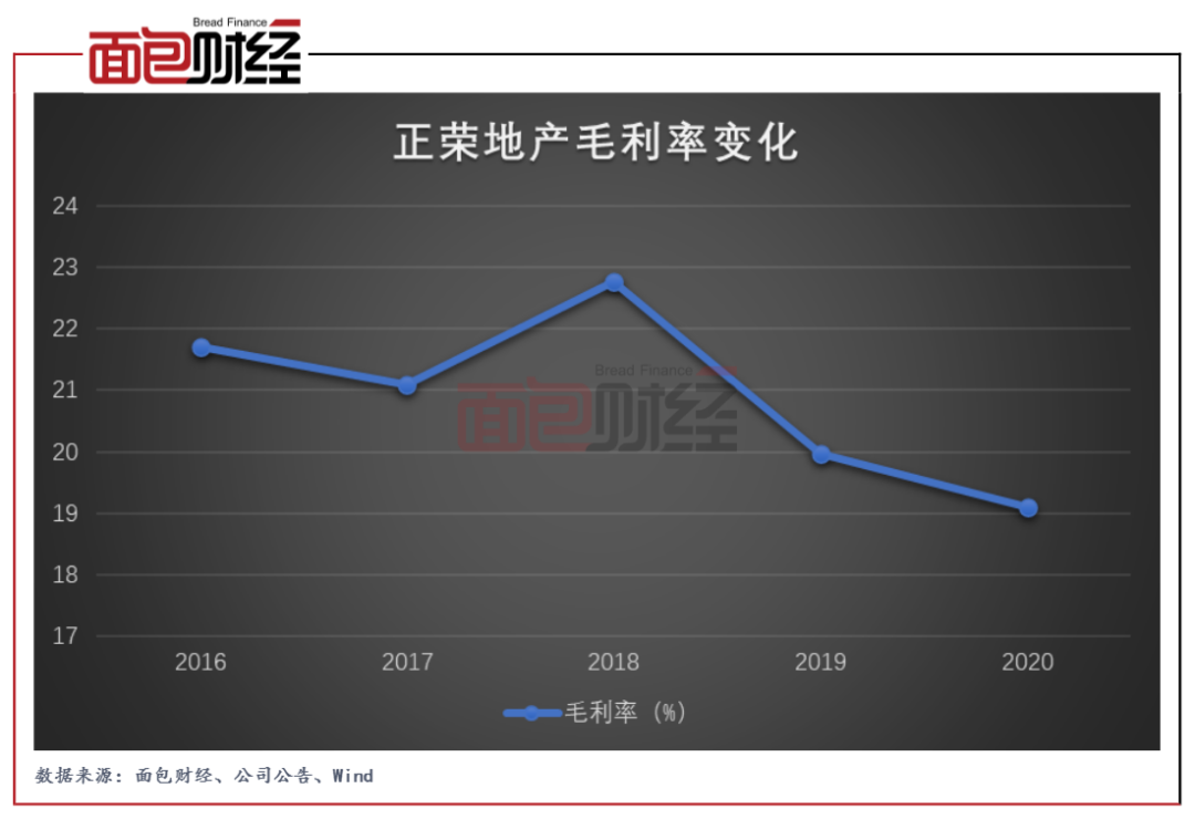 值得注意的是,正榮地產的毛利率在近幾年有持續下滑趨勢。2016年至2019年,公司的毛利率分別為21.7%、21.09%、22.76%、19.96%。和行業對比來看,正榮地產的毛利率處于較低水平。