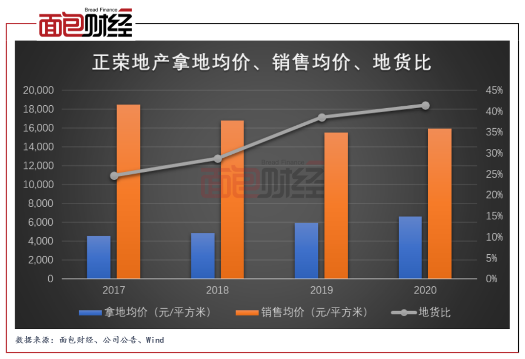 查閱相關數據,近幾年來,正榮地產的拿地均價逐步走高,但銷售均價相對降低,致使地貨比(權益拿地均價/銷售均價,下同)持續提升。2017年至2020年,公司拿地均價分別為4557元/平方米、4829元/平方米、5968元/平方米、6616元/平方米;銷售均價分別為18484元/平方米、16765元/平方米、15488元/平方米、15949元/平方米;地貨比分別為24.65%、28.80%、38.53%、41.48%。