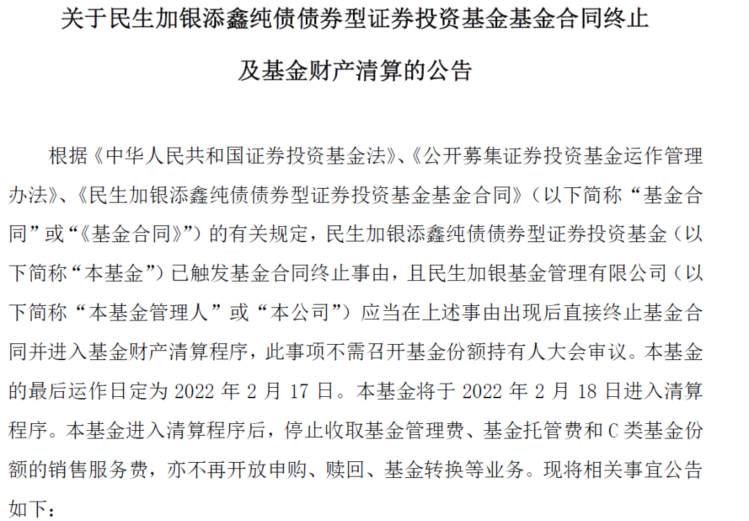 因規(guī)模不足5000萬元,民生加銀旗下債基觸發(fā)清盤