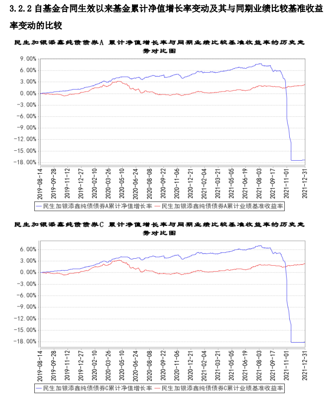 數(shù)據(jù)顯示,2021年下半年,民生加銀添鑫純債債券A、民生加銀添鑫純債債券C的凈值陡然下降,最終分別錄得當(dāng)年虧損21.43%和21.73%,也遠(yuǎn)遠(yuǎn)跑輸同期的業(yè)績基準(zhǔn)收益率。從單月業(yè)績來看,基金凈值大幅下跌主要發(fā)生在2021年11月。