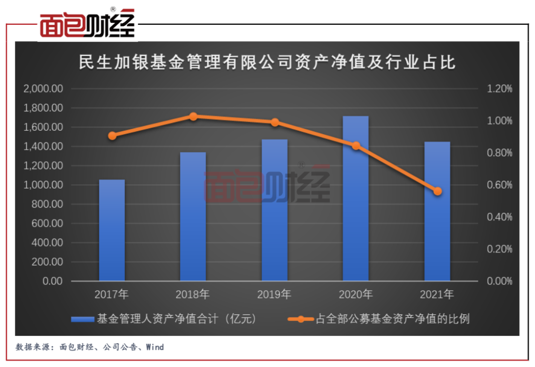 查閱近五年的資產(chǎn)凈值發(fā)現(xiàn),民生加銀基金2017年至2020年的資產(chǎn)凈值整體處于上升趨勢,但2021年出現(xiàn)明顯下降。對(duì)比來看,公募基金行業(yè)的整體規(guī)模則從2020年約20萬億元大幅上升至2021年突破25萬億元。一漲一跌共同作用下,民生加銀基金的行業(yè)資產(chǎn)凈值占比在2021年出現(xiàn)大比例下滑。