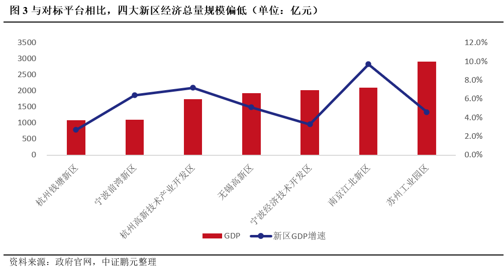四大新區經濟、財政實力如何?從當前經濟體量看,四大新區間梯隊分化較明顯,其中寧波前灣新區2020年經濟體量最大,并憑借高增速實現對杭州錢塘新區超越,寧波前灣新區與杭州錢塘新區2020年GDP規模均突破千億,紹興濱海新區為第二梯隊,湖州南太湖新區最低;財政實力方面,四大新區梯隊分化與經濟總量排名類似;與長三角對標平臺和省內同能級平臺比,四大新區經濟總量較弱,經濟密度方面,四大新區整體開發強度有待提升,且對全市經濟貢獻度普遍較低。